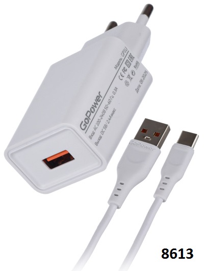 | 8613 | Адаптер (СЗУ) GoPower GP1U - 1*USB Белый (max 2.4A / 12W) + кабель Type-C, сетевой 220V, Блистер -картон (200) | 189.00 руб. | | |