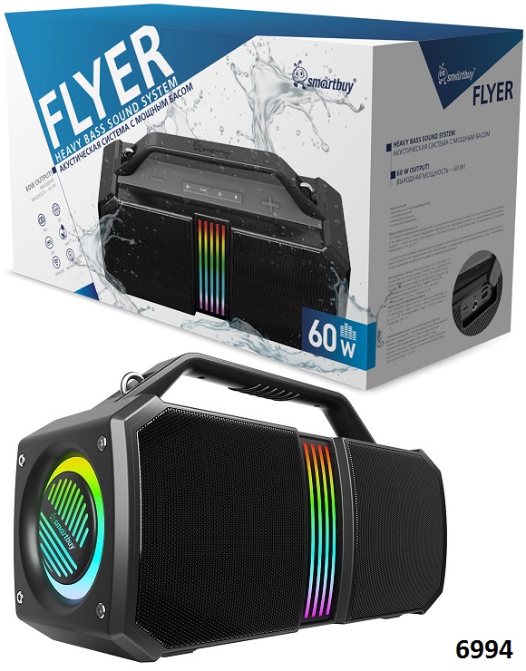 | 6994 | Мини-система SmartBuy SBS-5820 FLYER 60W FM/AUX/BT5.3/MP3 Чёрная, Li-ion аккум 2,6Ач/7,4V, поддержка USB/microSD, 12-20000Гц, RGB-подсветка, защита IP | 4 790.00 руб. | | |
