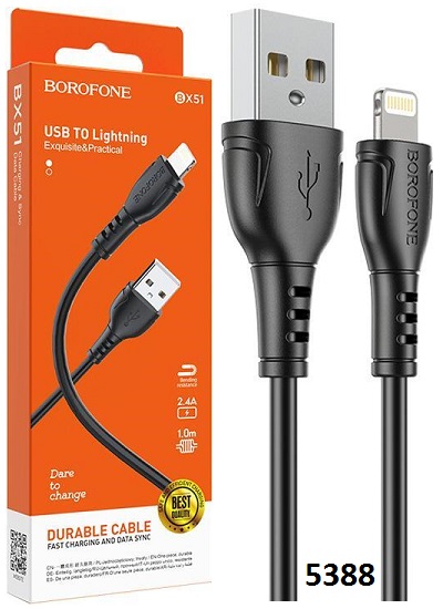 | 5388 | Кабель Borofone BX51 USB(AM)- Lightning(M) 1.0м 2.0A силиконовый, Чёрный (10) | 60.00 руб. | | |